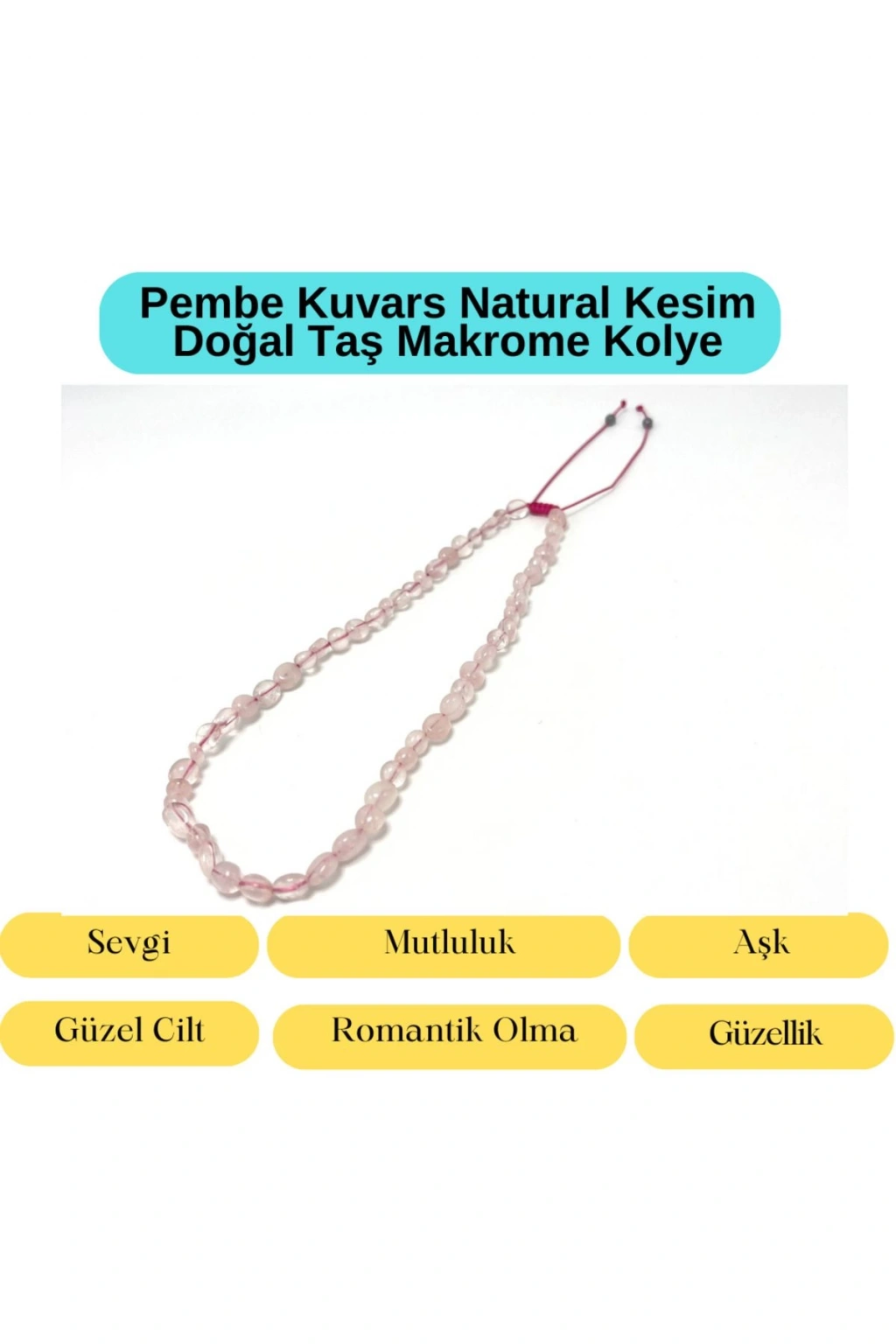 Sertifikalı Pembe Kuvars Natural Kesim Makrome Doğal Taş Kolye Ayarlanabilir Ölçü